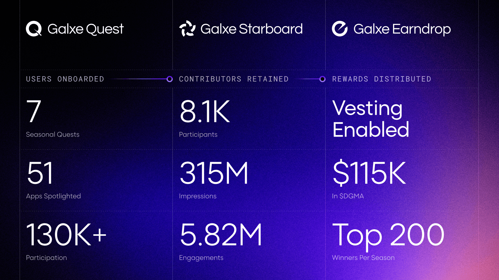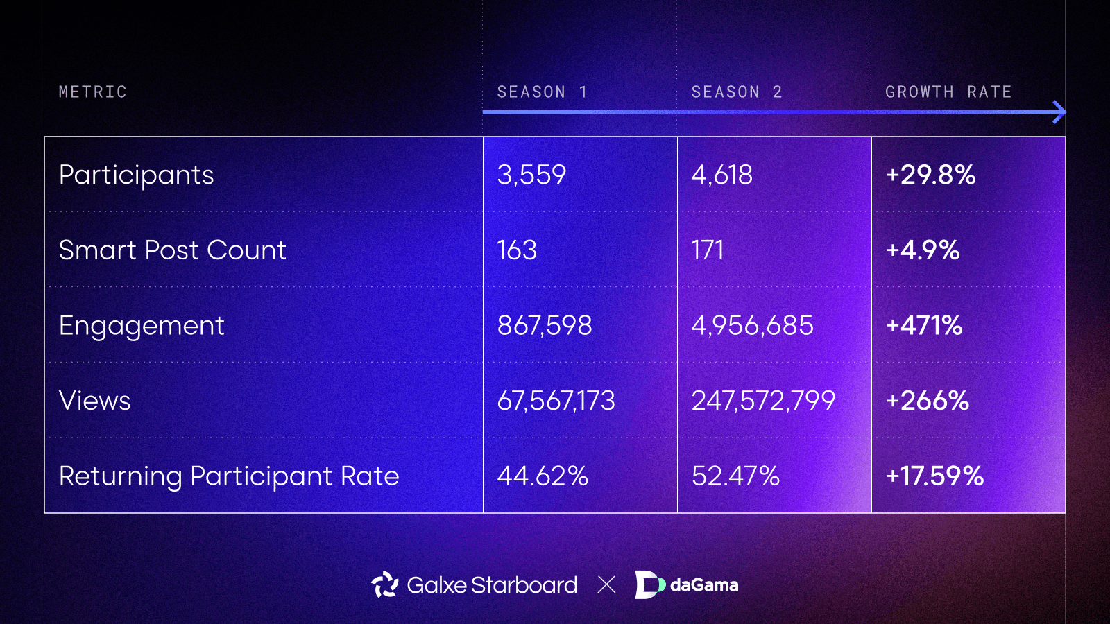 Business+ unlocked advanced contributor analytics through Starboard, giving daGama a data-driven view of who was creating social impact, how content was performing, and where engagement was growing. The program gave users ongoing reasons to return, post publicly, and compete, with Galxe's built-in anti-cheat system keeping Aura points aligned with quality participation throughout. The growth from Season 1 to Season 2 shows what that looks like in practice. Across both seasons, 8,177 participants and 4,370 contributors generated 315M impressions and 5.82M engagements, while the community produced 334 Smart Posts.