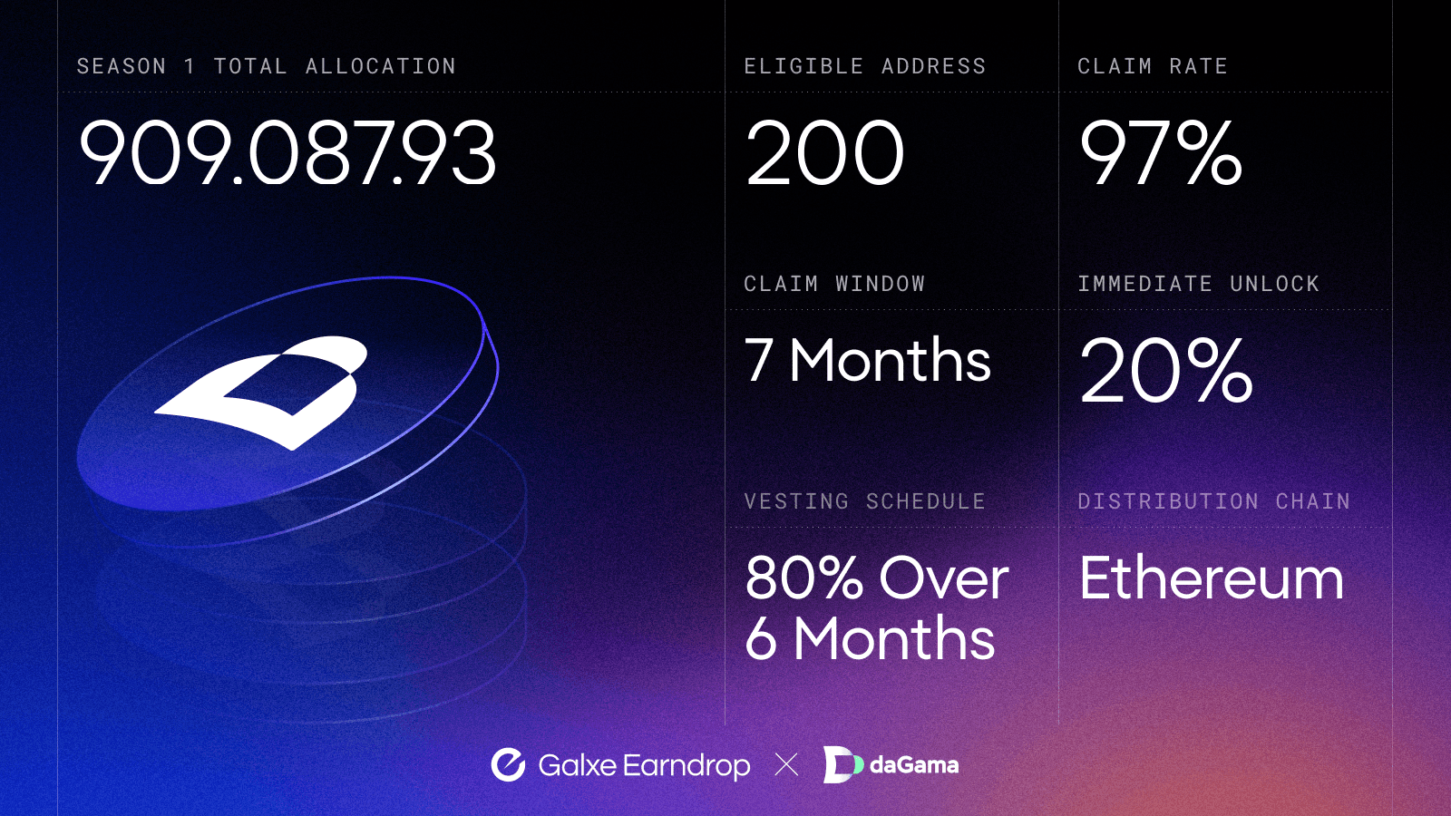 With support for customizable claim logic, tailored vesting schedules, and built-in Sybil protection, daGama streamline token distribution that matched their own incentive design using the Earndrop feature. daGama distributed $115K in $DGMA across two seasons on Ethereum, rewarding the top 200 participants per season. They were able to add a customized vesting structure of 20% immediate unlock with 80% over 6 months. The top 200 participants captured 75.22% of total Aura points in Season 1 and 85.5% in Season 2, confirming rewards flowed consistently to the program's most committed contributors.